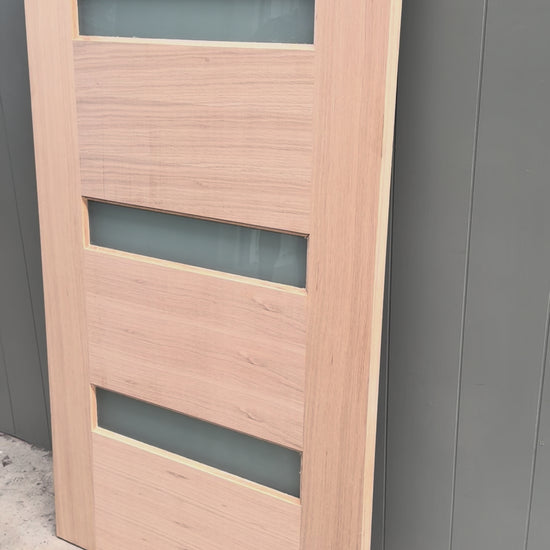 Featuring four vertically aligned obscure glass panels, this timber entrance door allows soft natural light to flow into your home while maintaining privacy — perfect for front entries, feature entrances, or statement façades.